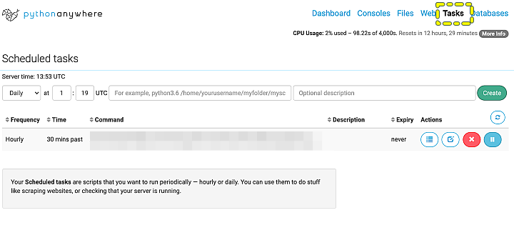 이에 방법을 찾아보다보니, 이런 정기적인 작업은 pythonanywhere Tasks탭을 이용하는 것이 좋다는 것을 알게 되었다. 시간이나 날짜별로 필요한 작업을 정기적으로 실행할 수 있는 메뉴로 여기에 코드를 등록하였더니 에러 없이 잘 동작하였다.