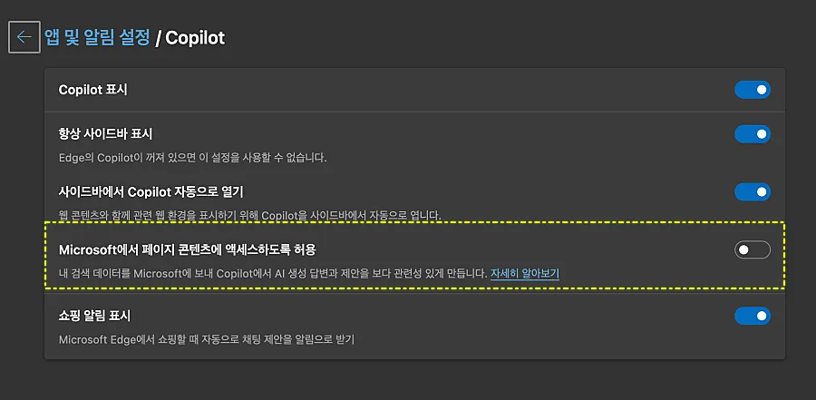 Copilot 아이콘 아래에 보면, 세로로 점 세개가 있습니다. 이 곳을 클릭하면 '알림 및 앱 설정'이 나오는데요. 이 곳에 들어가면 아래와 같이 앱별 설정 메뉴가 나옵니다. 여기서 Copilot에 들어간 후에 'Microsoft에서 페이지 콘텐츠에 액세스하도록 하여'을 켜야 PDF파일을 요약하거나 질의, 응답을 할 수 있습니다.